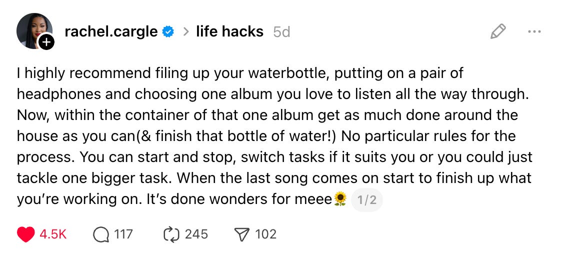 This post reminded me that taking care of ourselves is simple and necessary. I’m also following Rachel’s excellent advice (and listening to charli xcx’s brat while I finally tackle my many anxiety piles).